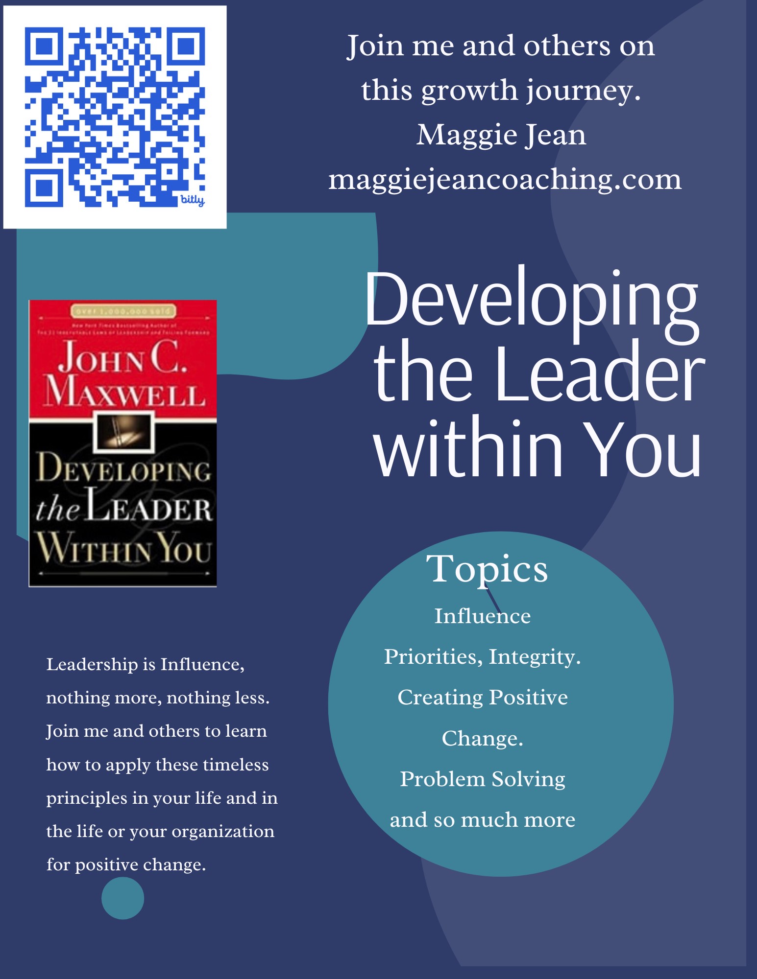 Verified"Leadership is more about responsibility than ability!”– Jim Tunney Maggie Jean coached and guided me through my journey from living with good intentions to intentional living. Through her dedication and commitment to my success, she led me from a place of fear and procrastination to living each day intentionally and on purpose. Together she and I took a voyage through Intentional Living by John C. Maxwell. She masterfully aligned the text with areas in my life and skillfully outlined the steps that led me towards clarity and professional fulfillment. My greatest accomplishment under her leadership and coaching was to complete the first draft of my manuscript. I allowed myself to procrastinate and avoid completing this project for more than 15 years. She helped me find why in writing the book. Identifying my why filled me with a renewed sense of urgency, which gave me the fuel I needed to finish the project two weeks before our agreed-upon date. Maggie Jean has the proven ability to help identify the barriers that produce stagnation in your personal or professional development. Her expert knowledge of John C. Maxwell's leadership development program and books will equip you with tools to tap into your potential and develop your hidden gifts, talents, and aspirations.